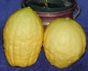 Yanaver Etrogim derive their name from Genoa, the port in northern Italy through which most Italian etrogim were once shipped. The etrogim actually grow in the southern part of Italy in Calabria. Note the sturdy girth. There are only a few kosher Etrog orchards left in S. Italy, the other orchards are devoted to production of citrons for culinary use. This variety is favored by many Chasidim, especially Chabad (Lubavitch), based on a Midrash, that Moses was transported from Sinai to Italy to see exactly what a “fruit of the goodly tree” was. Chabad have cultivated a variety of this Etrog in Israel – called “Kfar Chabad”.